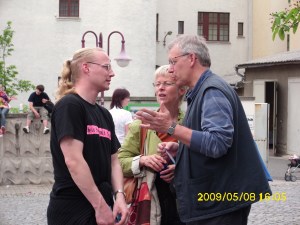 14:30 Uhr ging es zum historischen Stadtrundgang auf den Spuren jüdischen Lebens. Es wurden die Stolpersteine der Stadt Apolda besucht und den rund 50 TeilnehmerInnen viele interessante Informationen vermittelt. Anschließend wurde auf dem Brauhofplatz ein Street – Soccer Turnier abgehalten. Die Beteiligung war rege und 19 Mannschaften kämpften um den Sieg. Gegen 16:00 Uhr eröffneten der Bürgermeister der Stadt Apolda „Rüdiger Eisenbrand“ und der Anmelder Sandro Witt (DGB Jugend Thüringen) mit politischen Redebeiträgen die Veranstaltung. Danach begannen Lesungen, Redebeiträge aller in Apolda vertretenen demokratischen Parteien und ein tolles Konzert von 3 Bands aus Erfurt und Weimar. „Trotz eines starken Regengusses ließ sich niemand die Laune verderben und es wurde getanzt und gefeiert. Die Stimmung war super. Die Veranstaltung setzte ein Zeichen friedlichen Miteinanders und ein klares Signal gegen den erstarkenden Rechtsextremismus. 200 TeilnehmerInnen sind ein Riesenerfolg!“ bewerteten die Veranstalter den Tag. Die Polizei hatte das Gelände weitläufig abgesichert um etwaige Störungen von Rechtsextremen zu verhindern. Es blieb aber den ganzen Tag friedlich. Gegen 20 Uhr bedankten sich die Veranstalter bei den Besuchern und beendeten die Veranstaltung und wünschten allen einen sicheren und ruhigen Heimweg. „Im nächsten Jahr am 8. Mai 2010 werden wir sicher wieder alle gemeinsam ein klares Zeichen gegen Rechtsextremismus im Weimarer Land setzen, kommentiert Sandro Witt als Anmelder der Veranstaltung das schöne Erlebnis in Apolda.