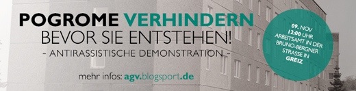 Wir rufen alle aktiven Antifaschist*innen und Antirassist*innen dazu auf, sich an der Demo am 9.11. (12 Uhr, vor dem Arbeitsamt in der Bruno-Bergner-Straße) in Greiz zu beteiligen. Lasst uns Pogrome verhindern, bevor sie entstehen! Wir solidarisieren uns mit allen Flüchtlingen in Greiz und anderswo. Für eine solidarische Gesellschaft jenseits von Diskriminierung und Volksgemeinschaft. Bleiberecht für alle!